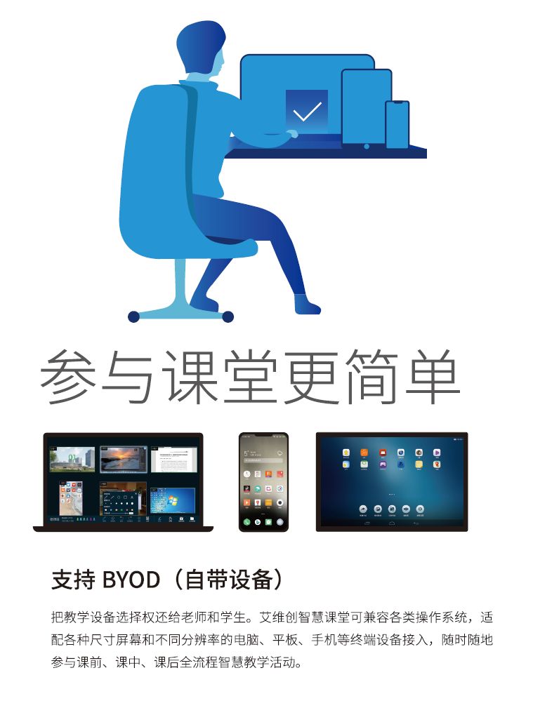 支持各種操作系統(tǒng)的平板、手機、電腦,適應各種大小的屏幕和分辨率。學習者自帶設備接入,開展自主研討、課題分享更便捷。