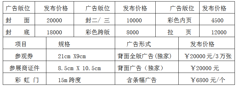 ≈會刊廣告≈ (會刊規(guī)格為130MM×210MM,廣告費一律預(yù)收一次性付清;因故不能參展企業(yè),可直接選擇會刊及展場廣告宣傳) 。