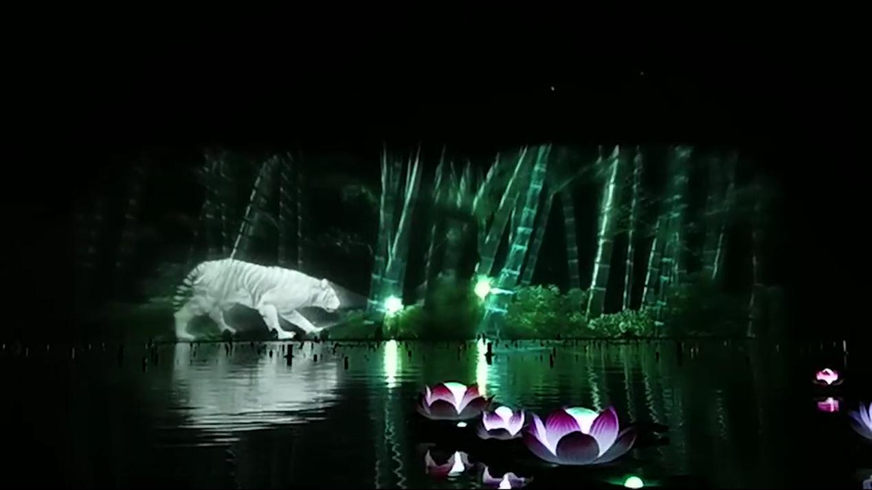 “人間仙境,盛世蓮開”的景象恰與桃花島上的標(biāo)志性建筑盛世蓮花塔遙相呼應(yīng),相得益彰。夜晚的盛世蓮花塔被360°全景投影包圍,利用3D Mapping投影技術(shù),通過21臺NEC PX1004UL激光工程投影機(jī),分三組將炫酷立體的影像畫面躍然于上。單機(jī)10000流明高亮度勾勒出清晰輪廓,倒映在湖面上花影婆娑。