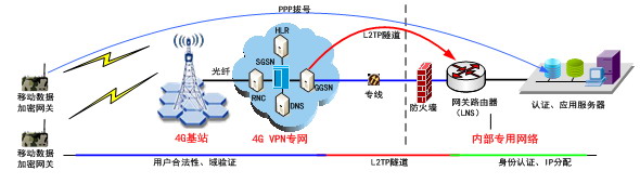 專用無線信道可采用4G VPN、軍用寬帶電臺、wifi自組網(wǎng)等方式。在非軍事行動中,一般采用信號穩(wěn)定、覆蓋范圍更廣的4G VPN系統(tǒng)。該系統(tǒng)具備一定的安全措施,如身份驗證、空中加密傳輸、專線連接等。4G VPN專網(wǎng)業(yè)務流程圖如下所示: