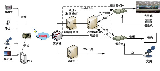 視音頻應用系統(tǒng)主要包括視頻服務器、視音頻編解碼服務器、視音頻矩陣、調(diào)音臺、音箱、話筒、大屏幕顯示系統(tǒng)以及視頻會議系統(tǒng)軟件等。視音頻應用系統(tǒng)工作流程如下圖所示: