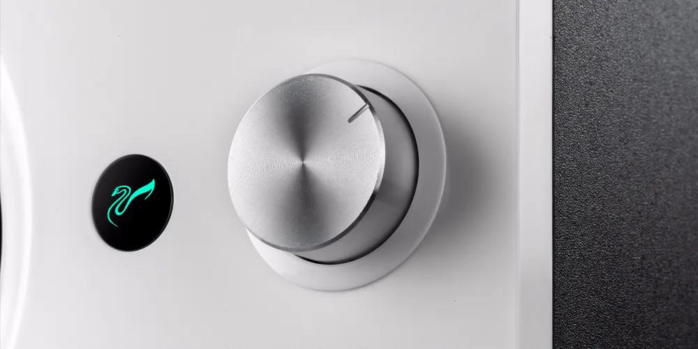 超低音前面板配備總音量調(diào)節(jié)旋鈕,通過(guò)點(diǎn)按該旋鈕還可以進(jìn)行輸入信號(hào)通道的切換,近場(chǎng)聽(tīng)音時(shí)可輕松操控。