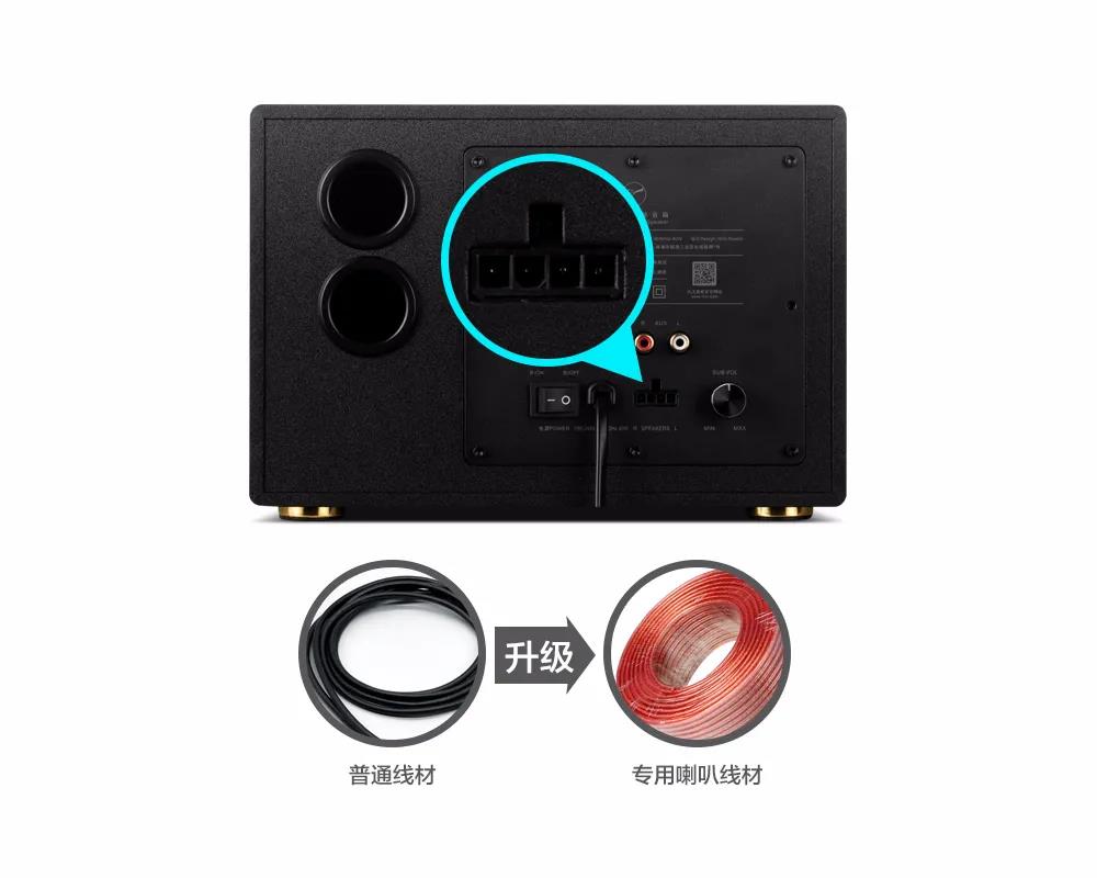 超低音的背面還配有低頻音量調(diào)節(jié),用戶可根據(jù)個(gè)人喜好調(diào)節(jié)低頻音量,打造個(gè)性化聽(tīng)音。此外,衛(wèi)星箱連接線升級(jí)為專用喇叭線材,并采用一體式端口設(shè)計(jì),連接更便捷,隨時(shí)聆聽(tīng)好聲音。