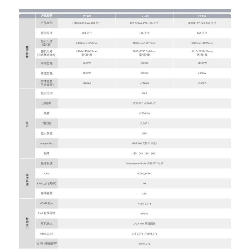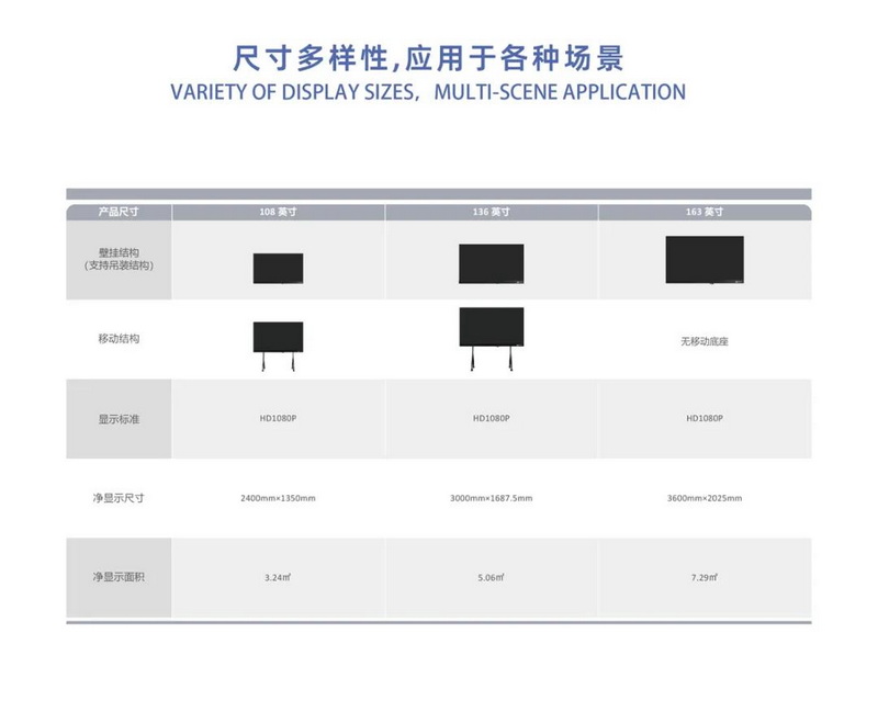 108“、136”、169“大尺寸,給你帶來(lái)沉浸式的視覺(jué)體驗(yàn),另外搭配堅(jiān)固的腳架方便移動(dòng),多種數(shù)據(jù)輸入輸出接口更加方便辦公。