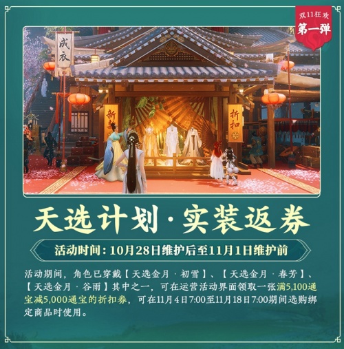 天選計劃第一彈開啟,建模重設、材質(zhì)重制,設計表現(xiàn)可謂更上一層樓,而外裝價格沒有絲毫變動,還有超值折扣券相贈!即日起至11月1日維護前,角色已穿戴【天選金月·初雪】、【天選金月·春芳】、【天選金月·谷雨】其中之一的俠士,可在運營活動界面領取一張滿5,100通寶減5,000通寶的折扣券,助力俠士嗨購雙十一!折扣券可在11月4日7:00至11月18日7:00期間選購綁定商品時使用,還請注意時間不要錯過。