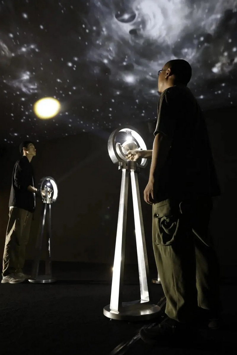 觀者通過(guò)操縱光控互動(dòng)形式,搜尋暗藏于空間(宇宙星云)中的聲音,光點(diǎn)所尋之處將呈現(xiàn)由著名戲劇演創(chuàng)人員錄制的經(jīng)典戲劇獨(dú)白。將時(shí)間與空間、經(jīng)典與當(dāng)下、公眾與演創(chuàng)人員置于同一維度:現(xiàn)實(shí)生活的戲劇時(shí)空,是謂剎那即永恒。