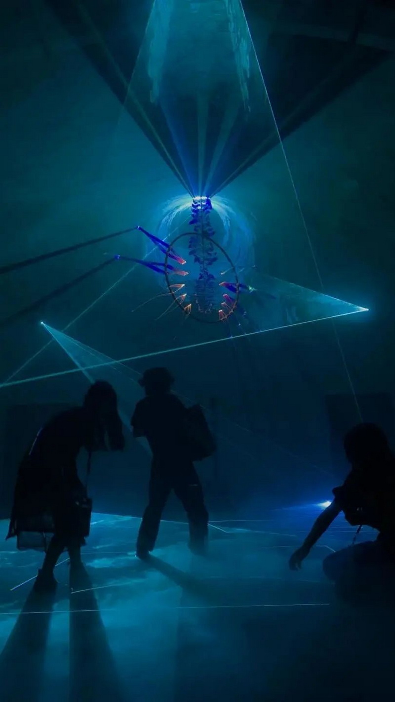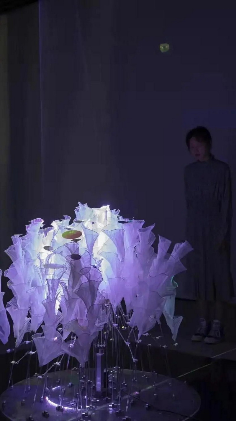 機(jī)械花在觀眾靠近時(shí)便收起綻放的花瓣,被激光掃描而出的虛空間包裹在內(nèi),當(dāng)觀眾離開(kāi)時(shí)悄然綻放從人面對(duì)他人時(shí)自我情緒隱藏的現(xiàn)象出發(fā),內(nèi)在世界無(wú)法完全獨(dú)立于外部世界存在,內(nèi)部世界與外部世界時(shí)刻處在一種動(dòng)態(tài)的“交互與平衡”之中。