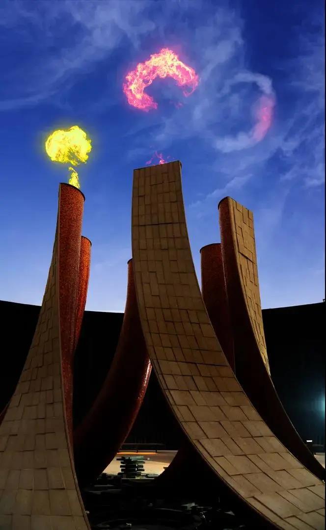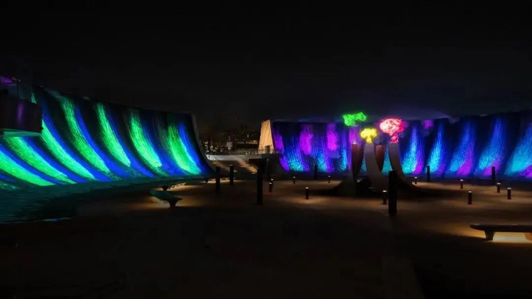 在迪拜世博上出現(xiàn)了一個(gè)水景觀裝置“Surreal(超現(xiàn)實(shí))”,它由 153 條水波組成,面積有半個(gè)足球場(chǎng)大!癝urreal”由美國(guó)洛杉磯水景設(shè)計(jì)公司W(wǎng)ET Design 創(chuàng)作完成,不同于常規(guī)的向上噴射的噴泉形式,而是模擬了瀑布從上而下流下的狀態(tài),另外,它會(huì)給人一種瀑布逆流的錯(cuò)覺,因?yàn)樗诳煲鞯降撞繒r(shí),又回調(diào)頭返回十幾米高的墻壁。在整個(gè)噴泉的中央,還有一個(gè)火焰噴射裝置,夜幕降臨,華燈初上,火焰和噴泉共同出現(xiàn),制造出一種水火共生的效果。
