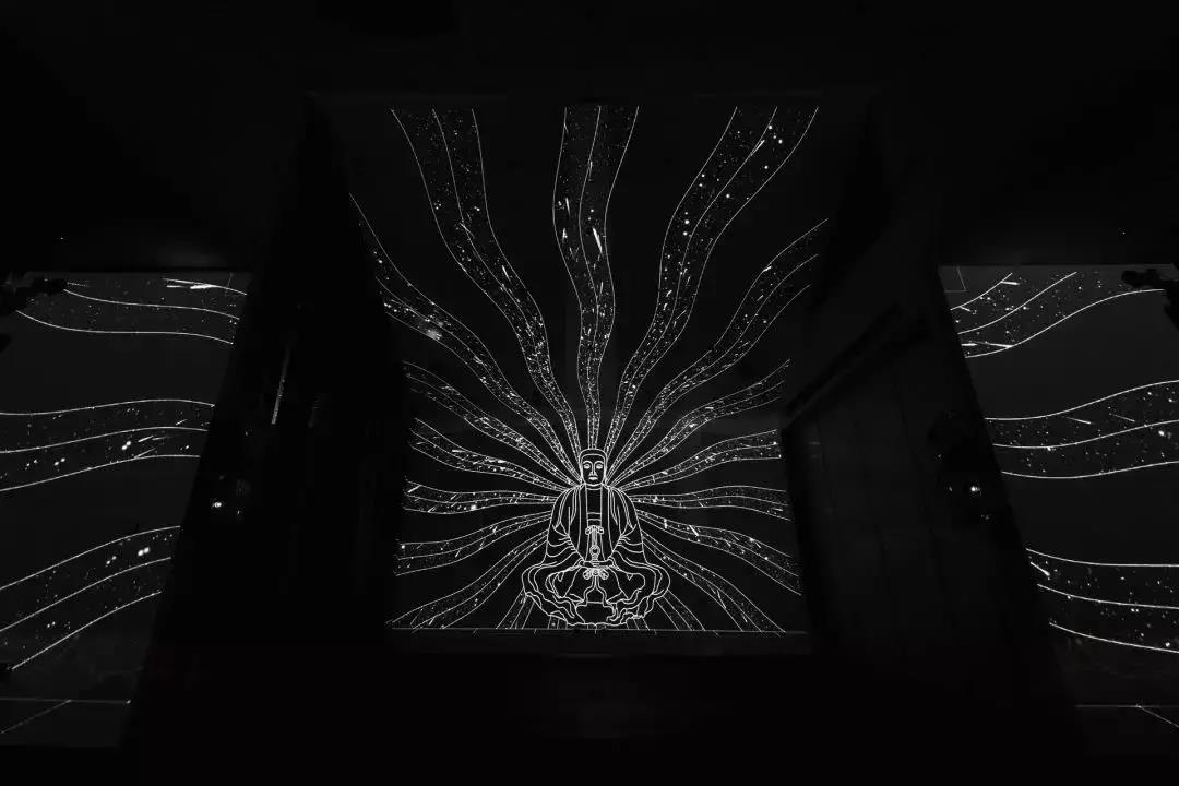 整個(gè)項(xiàng)目由四個(gè)部分組成,將高達(dá)7米的大佛主體、座下的蓮花、背景和地面都變成沉浸式投影的載體,把佛教故事、語義、元素結(jié)合到聲光電的層面,8分鐘的視覺演繹分成兩個(gè)部分,既展示傳統(tǒng)意義上的佛教經(jīng)典,又將賽博朋克的元素來展示未來佛的可能性。