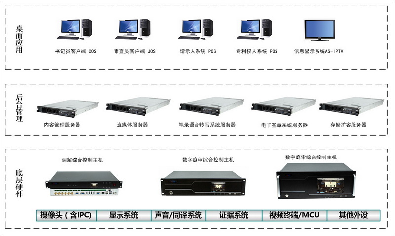 庭審媒體資源管理系統(tǒng)、流媒體服務(wù)系統(tǒng),審查員應(yīng)用系統(tǒng)、當(dāng)事人應(yīng)用系統(tǒng)、書記員應(yīng)用系統(tǒng)、語(yǔ)音筆錄轉(zhuǎn)寫系統(tǒng)、電子簽公章系統(tǒng)、遠(yuǎn)程審訊系統(tǒng)、公網(wǎng)直播系統(tǒng)、互聯(lián)網(wǎng)庭審系統(tǒng)。
