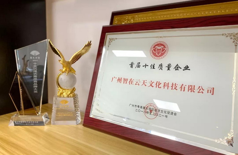 在兩大盛會上,智在云天分別榮獲了「中國灣區(qū)首屆十佳質(zhì)量企業(yè)」、「金孔雀獎·2021十大沉浸式集成商品牌大獎」、「金孔雀獎·2021十大光影藝術(shù)集成商品牌大獎」等多個獎項。
