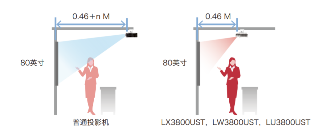 會(huì)議進(jìn)行中,非超短焦的投影機(jī)為了達(dá)到較好的投影尺寸,往往需要安裝距離屏幕較遠(yuǎn)處。為了避免遮擋,主講者時(shí)常需要不斷調(diào)整走位。配置有超短焦鏡頭的PJ LW3800UST、PJ LU3800UST,投射 80 英寸畫面僅需約 46cm,即使是在較為狹小的會(huì)議空間也能輕松地應(yīng)對。更短的安裝投影距離,不僅能有效規(guī)避遮擋,還能顯著的提升投影的亮度。