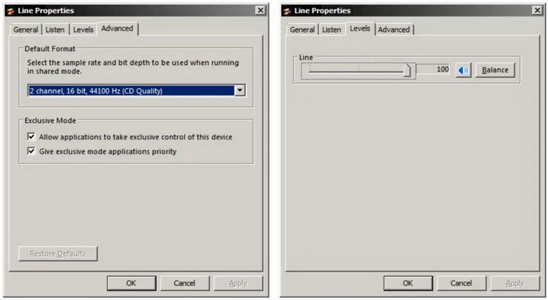 切換到“高級”選項卡,然后選擇“ 2通道,16位,44100 Hz(CD質(zhì)量)”,如下所示(左),F(xiàn)在單擊“應(yīng)用”。接下來,選擇“級別”選項卡,并確保將級別設(shè)置為最大,如下所示(右),并且不要設(shè)置靜音。DATS在1通道輸入或44.1 kHz以外的采樣頻率下將無法正常運(yùn)行。
