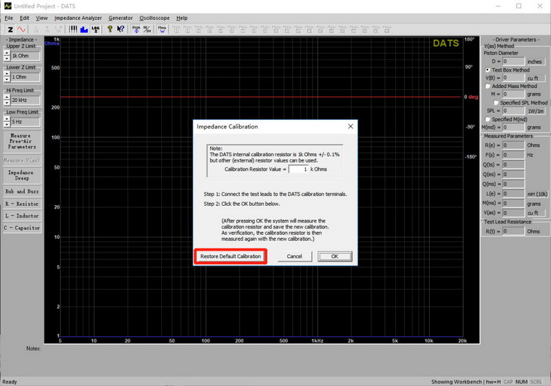 從DATS “Impedance Analyzer”菜單中選擇“Test Leads Calibration…”。將測試引線短路,然后單擊 “OK”,以針對測試引線電阻校準(zhǔn)軟件。測試引線電阻應(yīng)小于1歐姆,如下圖所示的DATS屏幕右下角所示。如果測試引線無法校準(zhǔn),在 “Impedance Analyzer”菜單下選擇 “Impedance Calibration…”,單擊 “Restore Default Calibration”,并重復(fù)測試引線的校準(zhǔn)過程。