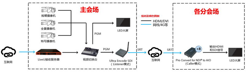 主會(huì)場(chǎng)部署的三臺(tái)影視高清攝像機(jī)拍攝的視頻信號(hào)連接到切換臺(tái),切換臺(tái)制作后將2路PGM信號(hào)分別輸出給2臺(tái)美樂威Ultra Encode SDI編碼盒(1主1備),編碼器作為SRT Listener,可最高支持連接8個(gè)客戶端,然后通過主會(huì)場(chǎng)移動(dòng)國(guó)家應(yīng)急通信車提供的網(wǎng)絡(luò)進(jìn)行互聯(lián)網(wǎng)傳輸;在其余8個(gè)會(huì)場(chǎng),美樂威解碼器和LED大屏連接,解碼器作為SRT Caller,把解碼后的SRT流輸出給大屏顯示供與會(huì)代表觀看;顒(dòng)期間,各分會(huì)場(chǎng)可清晰看到主會(huì)場(chǎng)輸出的PGM信號(hào),畫面流程清晰,現(xiàn)場(chǎng)感知良好,整場(chǎng)活動(dòng)受到了省市區(qū)(縣)政府及參會(huì)單位的一致好評(píng)。