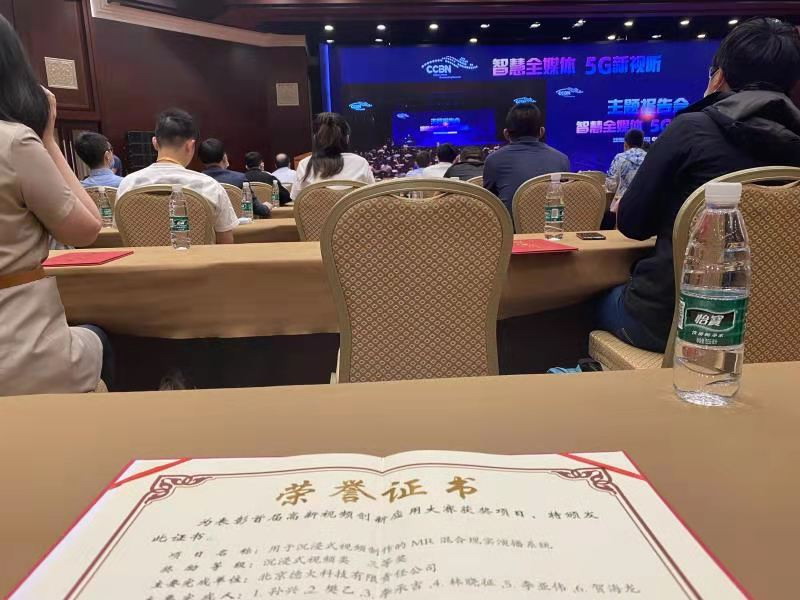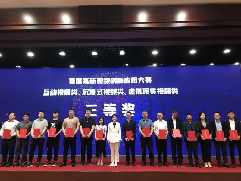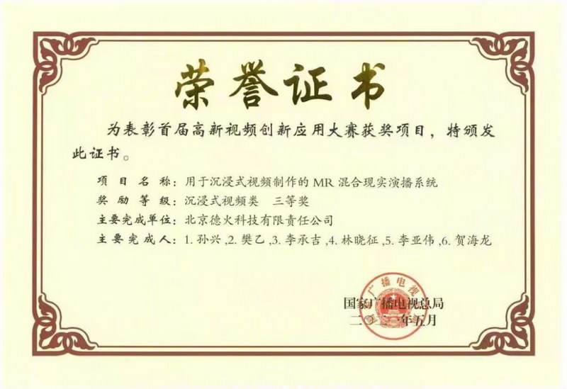當(dāng)日主題報(bào)告會(huì)上,首屆高新視頻創(chuàng)新應(yīng)用大賽頒獎(jiǎng)儀式在北京國(guó)際會(huì)議中心隆重舉行。經(jīng)過(guò)專家組委會(huì)層層篩選,千家企業(yè)強(qiáng)強(qiáng)角逐,北京德火科技、南京廣播電臺(tái)&北京德火科技通過(guò)5G應(yīng)用、技術(shù)演示、效果呈現(xiàn)等多方面優(yōu)異表現(xiàn),經(jīng)過(guò)多番評(píng)審,最終憑借《沉浸式視頻制作的MR混合現(xiàn)實(shí)演播系統(tǒng)》、《AR實(shí)體沉浸式全景仿真演播室系統(tǒng)》獲得沉浸式視頻類三等獎(jiǎng)。