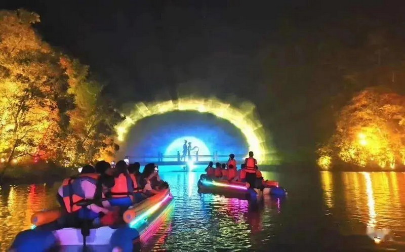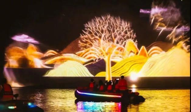 采用最新5D、全息投影、互動新媒體、裝置藝術(shù)、燈光秀等技術(shù)與九龍?zhí)短赜械乃系は嫉孛、巖石、洞穴相結(jié)合,建設(shè)成為全國首個水上丹霞行浸式山水夜游項目。