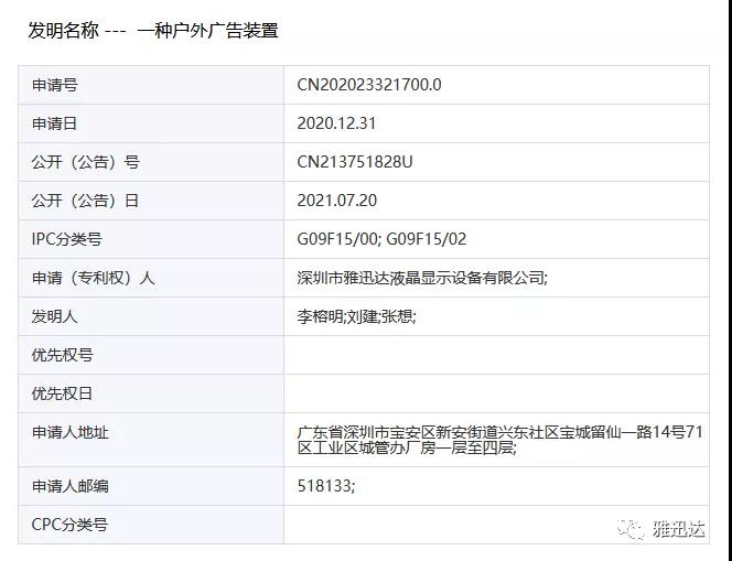 雅迅達(dá)新專利獲批:一種戶外廣告裝置