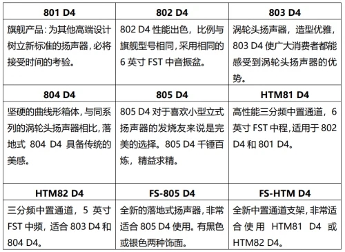 全新800鉆石系列依然擁有七個(gè)型號(hào):805 D4二分頻落地式揚(yáng)聲器;804 D4、803 D4和802 D4三分頻落地式揚(yáng)聲器;Bowers & Wilkins隆重推出的旗艦產(chǎn)品801 D4,以取代舊款800 D3;以及兩款高性能中置聲道揚(yáng)聲器HTM81 D4和HTM82 D4,用于家庭影院配置。