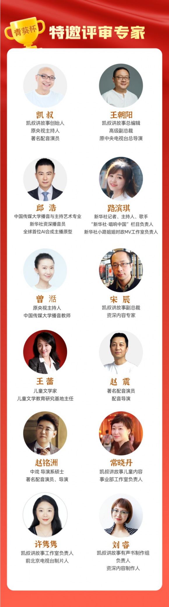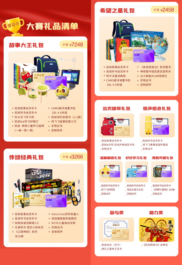 活動從凱叔講故事App中精選9個優(yōu)質(zhì)中國故事作為范本,包括紅色故事、國學、名著三個方向,參與活動的小朋友可從中任意選擇一個,自行演繹,拍成視頻,以投稿的方式,上傳至新華社客戶端青春版上報名。本次大賽特別邀請到:凱叔講故事App創(chuàng)始人、原央視主持人凱叔,凱叔講故事App總編輯高級副總裁王朝陽等12位評審專家,通過投票和評審兩個環(huán)節(jié),最終評選出綜合表達力、創(chuàng)造力、完整度三方面表現(xiàn)優(yōu)異的小朋友,入選星星榜(300名)、青葵榜(100名),屆時會發(fā)放新華社客戶端青春版和“凱叔講故事”認證的大賽證書和禮包,以資鼓勵。
