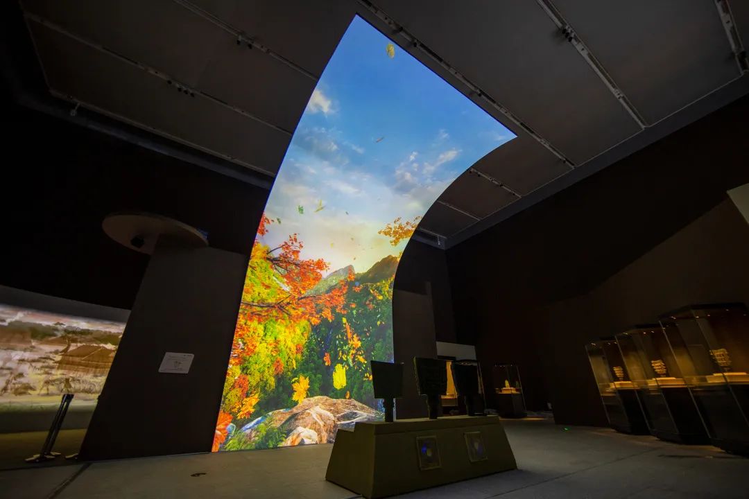 遠(yuǎn)山祭祀之景、通天曲面環(huán)繞,場(chǎng)景于屏幕中延伸至現(xiàn)實(shí),虛與實(shí)的巧妙結(jié)合,帶領(lǐng)我們進(jìn)入一個(gè)又一個(gè)的沉浸之景……