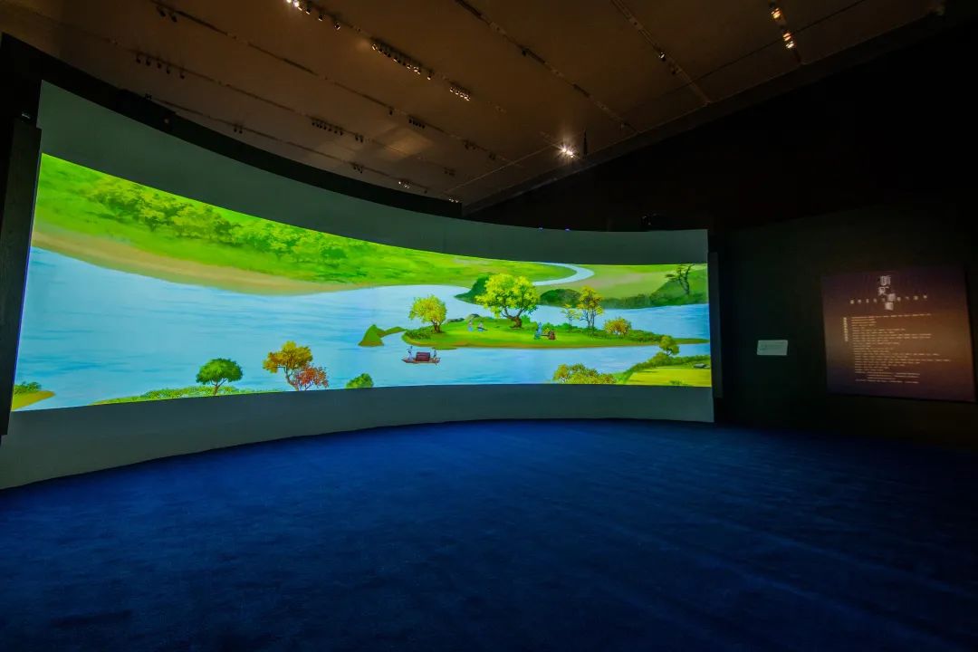 11米投影環(huán)幕呈現(xiàn)出古質(zhì)感的河流長(zhǎng)卷畫面,通過多個(gè)故事情節(jié)回顧湖湘古樂器,打造一條湖湘音樂之河。畫面聚焦三倆小人彈奏,古今樂器重奏《瀏陽河》樂曲,讓我們一同去追隨歷史,感悟傳承之火生生不息。