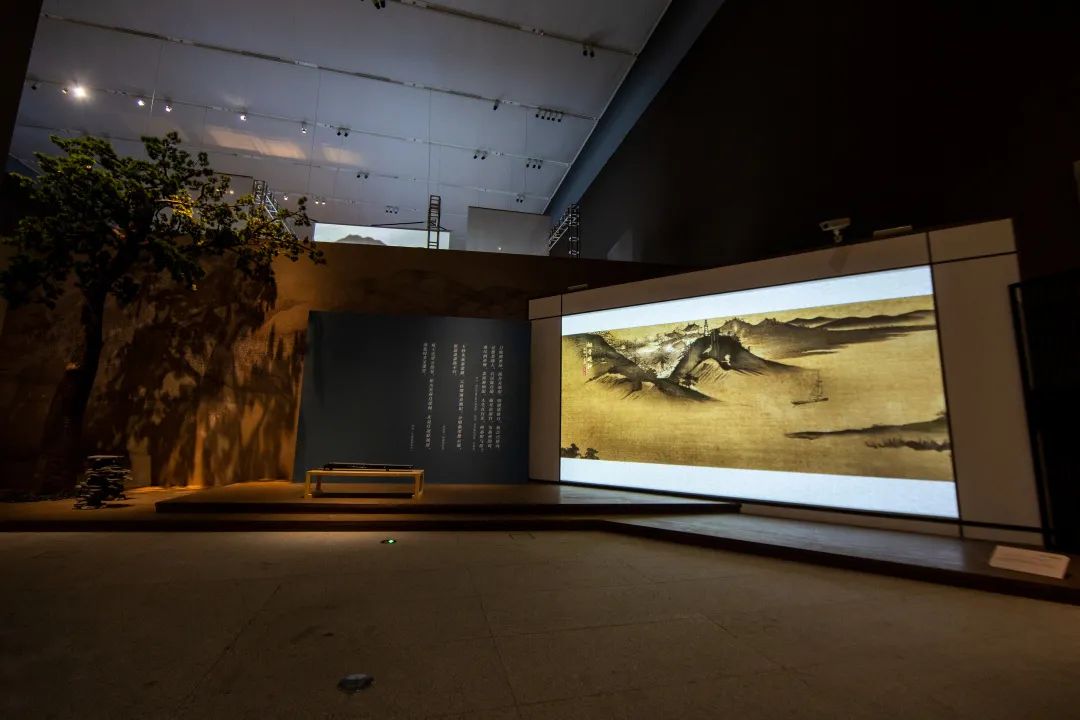 影片對(duì)《瀟湘八景圖》復(fù)刻再現(xiàn),結(jié)合古琴曲《瀟湘水云》,同步設(shè)置音樂可視化視聽演繹互動(dòng)演繹聯(lián)動(dòng)展示,呈現(xiàn)出一幅活化的美景畫卷。山間石峰錯(cuò)落分布,流水、清潭點(diǎn)綴其間,水流緩慢琴聲悠悠,給人靈動(dòng)的空間體驗(yàn)。