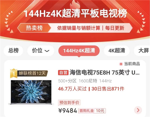 憑借更高的刷新率帶來(lái)更沉浸式的觀(guān)感體驗(yàn),高刷電視正在成為電視行業(yè)當(dāng)下的高增長(zhǎng)賽道。近日,京東平臺(tái)的數(shù)據(jù)顯示,海信E8H繼登頂家用平板電視榜TOP1之后,再登144Hz 4K超清平板電視榜TOP1,并連續(xù)多天蟬聯(lián)榜首,成為備受影音游戲玩家青睞的新晉爆款游戲神器。