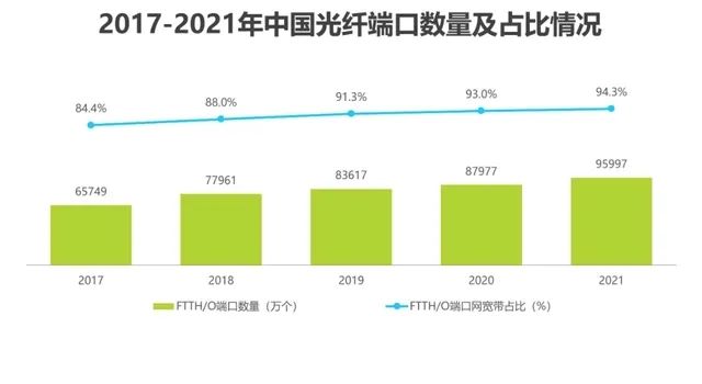 2021年,我國(guó)光纖接入(FTTH/O)端口已達(dá)到對(duì)互聯(lián)網(wǎng)寬帶端口的高度覆蓋,光纖接入能力已普遍超過(guò)百兆,并向千兆以上速率不斷升級(jí)。