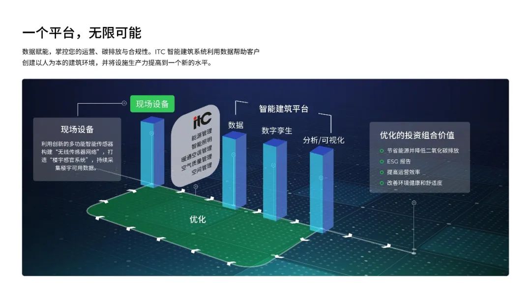報(bào)告提到90%的碳排放來自建筑運(yùn)營,其中耗電量占全球耗電量55%;當(dāng)前樓宇管理系統(tǒng)在系統(tǒng)配置、監(jiān)測(cè)準(zhǔn)確率、設(shè)備或系統(tǒng)集成穩(wěn)定性、智能化控制、運(yùn)維水平等方面都存在不同程度的問題。為改變這一現(xiàn)狀,itc開發(fā)出一系列的創(chuàng)新技術(shù)來構(gòu)建可靠的智能建筑基礎(chǔ)設(shè)施,通過現(xiàn)場設(shè)備、應(yīng)用模塊及具有強(qiáng)大分析和可視化的智能建筑平臺(tái),為建筑運(yùn)營核心領(lǐng)域帶來全新效率,對(duì)樓宇進(jìn)行持續(xù)優(yōu)化,實(shí)現(xiàn)最佳的運(yùn)營性能。