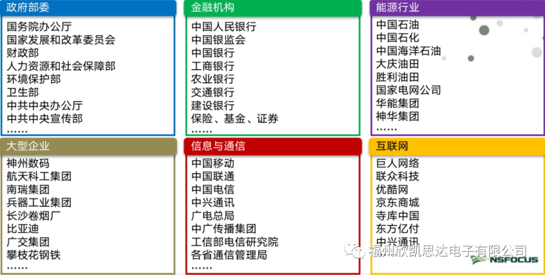 綠盟遠(yuǎn)程安全評(píng)估系統(tǒng)的客戶遍布各行各業(yè)、行業(yè)遍布如政府部委、金融機(jī)構(gòu)、能源行業(yè)、大型企業(yè)、信息與通信、互聯(lián)網(wǎng)行業(yè)等;重要核心客戶如國務(wù)院、財(cái)政部、中共中央辦公廳、四大行、中石油、中石化、國家電網(wǎng)、三大運(yùn)營商移動(dòng)聯(lián)通電信、京東等;
