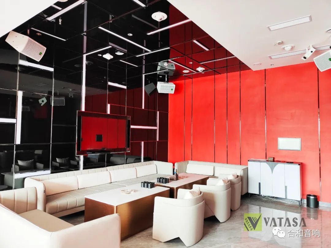 包房選用了VATASA唯達森定制白色V系列音箱,將典雅白完美的融合了空間設計。低頻強勁、結實,中高頻明亮,具有穿透力,且人聲部分表現(xiàn)相當突出。獨特的寬指向號角設計,使房間覆蓋力更加均勻。適用于KTV、私人會所等各種現(xiàn)場音樂場地。