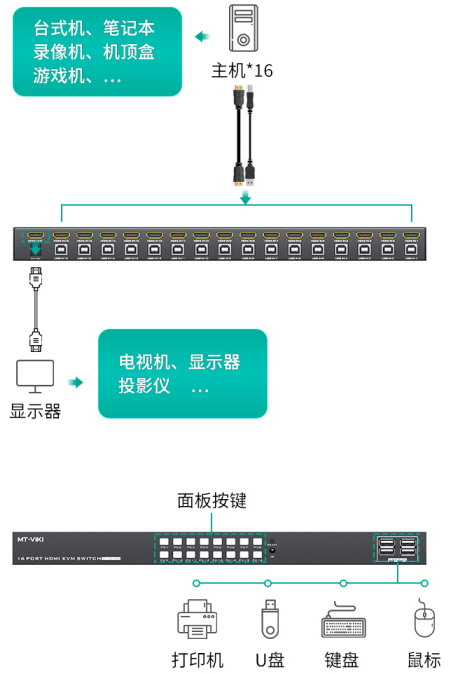 MT-1601HK-C是一款手動(dòng) USB KVM 多電腦切換器,一套鍵鼠、顯示器控制16臺(tái)主機(jī),隨時(shí)自由切換無需設(shè)備反復(fù)拔插,隨時(shí)掌控多個(gè)畫面。帶有USB2.0端口,支持任何USB2.0設(shè)備,免安裝驅(qū)動(dòng),即插即用。廣泛應(yīng)用于數(shù)據(jù)中心、視頻監(jiān)控、機(jī)房控制、電子監(jiān)控等。