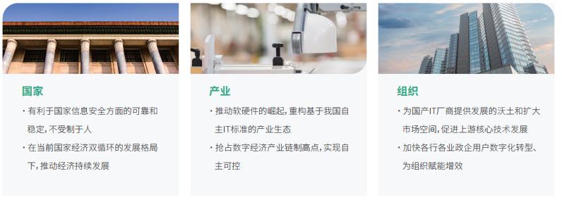 為了解決本質(zhì)安全的問題,“信創(chuàng)”(即信息技術(shù)應(yīng)用創(chuàng)新產(chǎn)業(yè))這一國家戰(zhàn)略應(yīng)運而生,旨在逐步建立基于自己的 IT 底層架構(gòu)和標準,形成自有開放生態(tài),通俗來講,就是在核心芯片、基礎(chǔ)硬件、操作系統(tǒng)、中間件、數(shù)據(jù)服務(wù)器等領(lǐng)域?qū)崿F(xiàn)國產(chǎn)替代、實現(xiàn)自主可控。