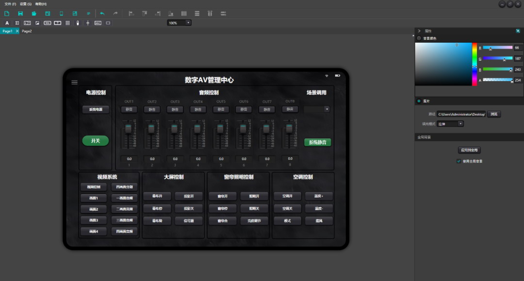 自定義用戶界面功能強(qiáng)大、操作簡便,除了常見的新建、保存、打開、撤銷、返回、對齊外,還有模板、替換工具、旋轉(zhuǎn)、替換IP等功能,另外文本、通道、預(yù)設(shè)、圖片、按鈕、狀態(tài)按鈕、路由、電平、增益、音量值、邊框等所有控件,都可在右邊的屬性欄對其進(jìn)行設(shè)置。