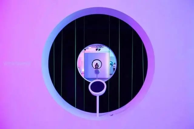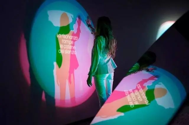 大圓鏡面將體驗者的彩色光影反射到墻面上。當(dāng)體驗者將自己置于光錐中時,便會在墻面上找到共鳴的引語。