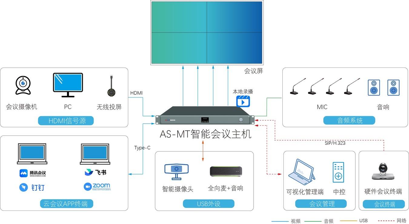 高清攝像機(jī)、全向麥、會(huì)議終端、一體化會(huì)議大屏等硬件設(shè)備無(wú)縫接入MT智能會(huì)議主機(jī)。實(shí)現(xiàn)會(huì)議室的音頻、視頻、會(huì)議控制、視頻會(huì)議、會(huì)議錄播。