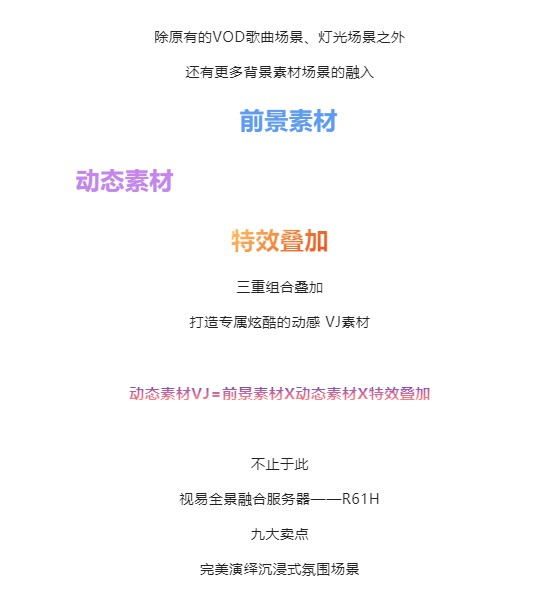VOD畫面接入R61H實現(xiàn)智能開窗效果,同時可以根據(jù)場景編排,實現(xiàn)放大縮小效果等效果,滿足各類開窗模式需求,可以一邊唱歌,一邊欣賞C沉浸式氛圍。