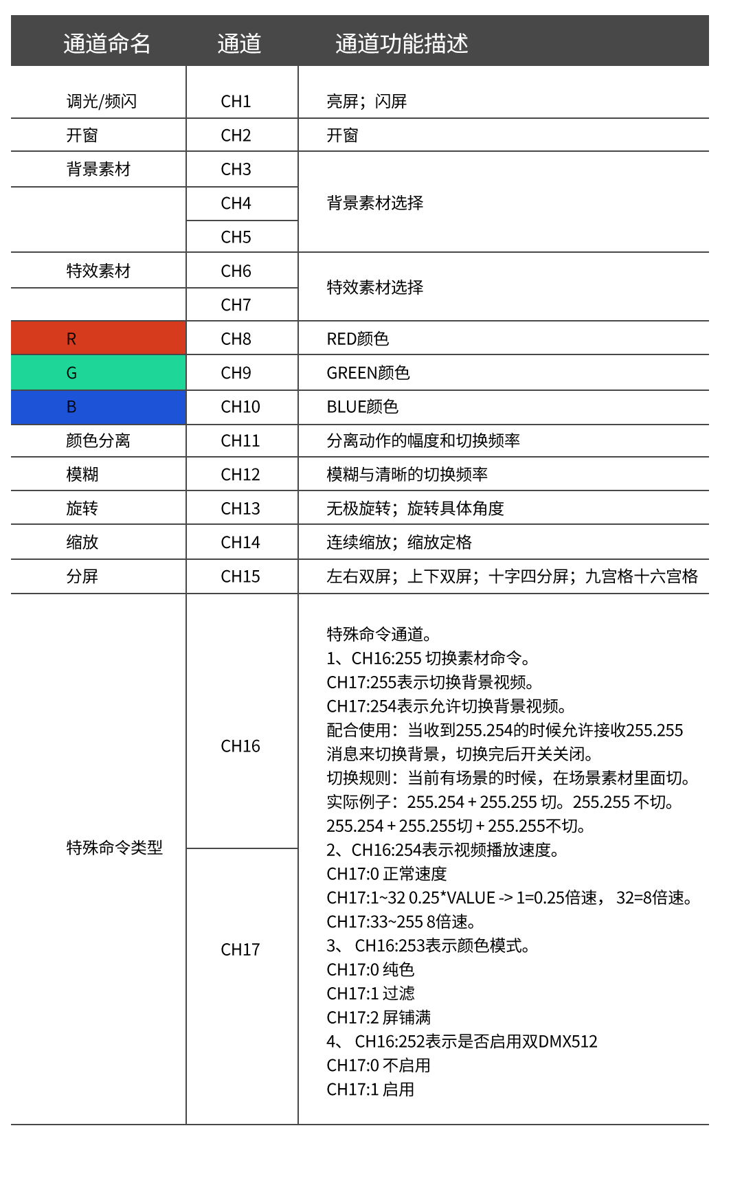 R61H通過512協(xié)議與燈光一同編入場景,可以與燈光實現(xiàn)效果同步。如全場熄燈時屏幕也熄滅,全場亮紅時,素材也過濾成紅色。