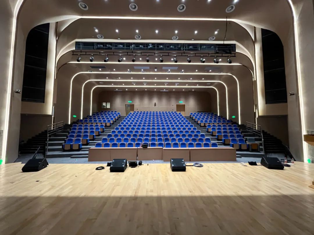 舞臺(tái)左右各2只15寸全頻音箱FR-X15aHQ增強(qiáng)了聲音的空間立體感,提供全場(chǎng)主擴(kuò)聲。舞臺(tái)中央吊掛暗裝于臺(tái)口上聲橋內(nèi),中置共2只12寸全頻音箱FR-X12aHQ,彌補(bǔ)了左右主擴(kuò)音箱投射方向的不足,使全場(chǎng)聲壓級(jí)分布均勻。