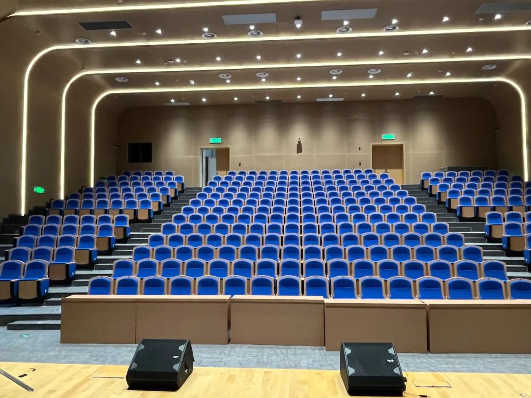 音箱的安裝位置和聲輻射方向,保證了觀眾席中各處有合適的響度、均勻度、清晰度和豐滿度,在觀眾和講臺(tái)的后墻,適當(dāng)吸聲處理,減少后部反射聲,天花和側(cè)墻則作為反射面處理,用配置擴(kuò)散結(jié)構(gòu)進(jìn)行聲折射和擴(kuò)散,以增強(qiáng)早期反射聲,提高語言清晰度、使聲場(chǎng)分布均勻,同時(shí)利用天花頂和側(cè)墻后的空間設(shè)置低頻吸聲結(jié)構(gòu),減少低頻混響時(shí)間。