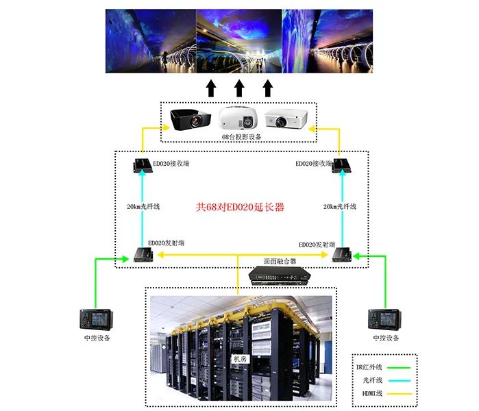 那么舉個簡單的例子,2016年白云機(jī)場打造的“時空隧道”就是很好的集聽覺視覺為一體的運用場景,我們也有幸到現(xiàn)場體驗了一把美輪美奐的炫酷時空長廊,在這樣的時空長廊里,就采用了68臺投影儀,68套光纖延長器,還有中控設(shè)備把服務(wù)器和需要展示的視覺、聽覺給完美呈現(xiàn)。