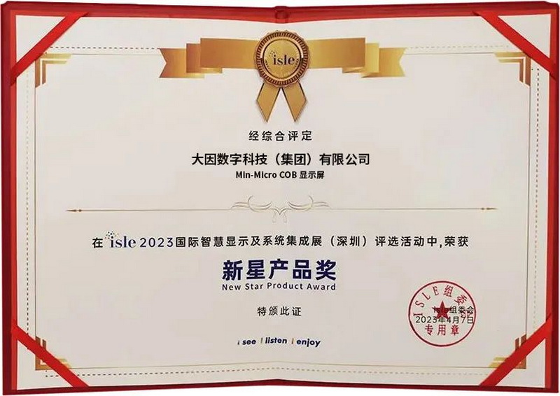 4月7日-4月9日,ISLE國際智慧顯示及系統(tǒng)集成展在深圳國際會展中心隆重舉行,在展會期間舉辦的ISLE 2023優(yōu)秀展示產(chǎn)品評選活動中,DANANCOID憑借高質(zhì)量的顯示屏產(chǎn)品和豐富的場景應(yīng)用方案,Min-Micro COB顯示屏和智慧顯示一體機(jī)分別獲得新星產(chǎn)品獎、創(chuàng)新獎。