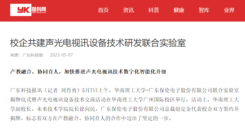 為進(jìn)一步拓展校企合作的深度和廣度,5月7日上午,廣東保倫電子股份有限公司(itc)與華南理工大學(xué)未來技術(shù)學(xué)院共建的聲光電視訊數(shù)智產(chǎn)品聯(lián)合實(shí)驗(yàn)室簽約暨揭牌儀式在華南理工大學(xué)廣州國際校區(qū)順利舉辦。本次合作簽約意義重大,標(biāo)志著校企雙方在產(chǎn)教融合、協(xié)同育人的合作中邁出了堅(jiān)定的一步,著眼于打通從實(shí)驗(yàn)室到產(chǎn)業(yè)化的“最后一公里”,引領(lǐng)行業(yè)高質(zhì)量發(fā)展。