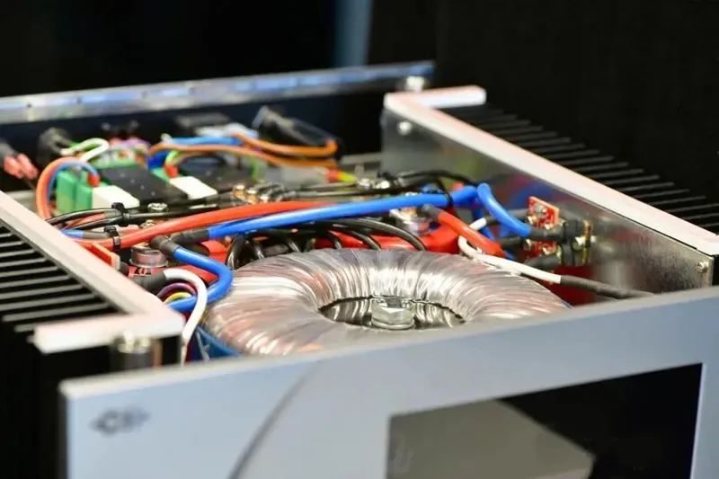 A1.5的內(nèi)部最搶眼的是那二個(gè)紅色的大型濾波電容,看起來(lái)像二個(gè)可樂(lè)罐。再來(lái)則是1700VA的大型環(huán)形變壓器,散熱片內(nèi)藏,由于溫度不高,頂蓋的散熱孔已經(jīng)足夠散熱之用。