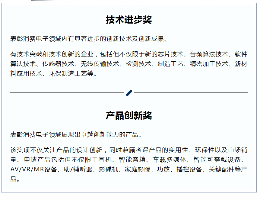 4、官方平臺(tái)曝光:包括但不僅于在中國(guó)國(guó)際音頻產(chǎn)業(yè)大會(huì)官方平臺(tái)上,給予獲獎(jiǎng)產(chǎn)品更多曝光機(jī)會(huì)5、行業(yè)標(biāo)準(zhǔn)制定:有機(jī)會(huì)被邀請(qǐng)參與制定或修訂行業(yè)標(biāo)準(zhǔn),影響行業(yè)發(fā)展方向