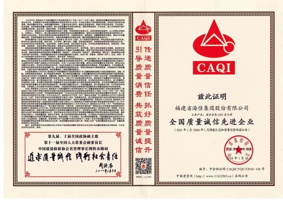 這份榮譽(yù)開(kāi)啟海佳集團(tuán)2024品質(zhì)之路,繼續(xù)深化質(zhì)量控制體系,為全國(guó)乃至全球消費(fèi)者提供更優(yōu)質(zhì)的LED顯示產(chǎn)品品質(zhì)體驗(yàn)。
