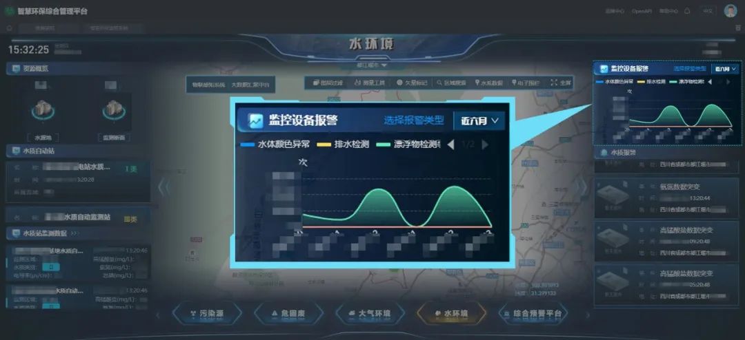 通過水質(zhì)監(jiān)測站、大氣監(jiān)測站等,水環(huán)境能基于各項數(shù)據(jù)更科學(xué)地展現(xiàn),管理中心統(tǒng)一匯聚、整合多方數(shù)據(jù)資源并地圖可視化展示,使得內(nèi)場運維人員可以在一個系統(tǒng)上完成對水環(huán)境各項指標(biāo)的快速巡檢,及時了解區(qū)域內(nèi)的水質(zhì)情況。
