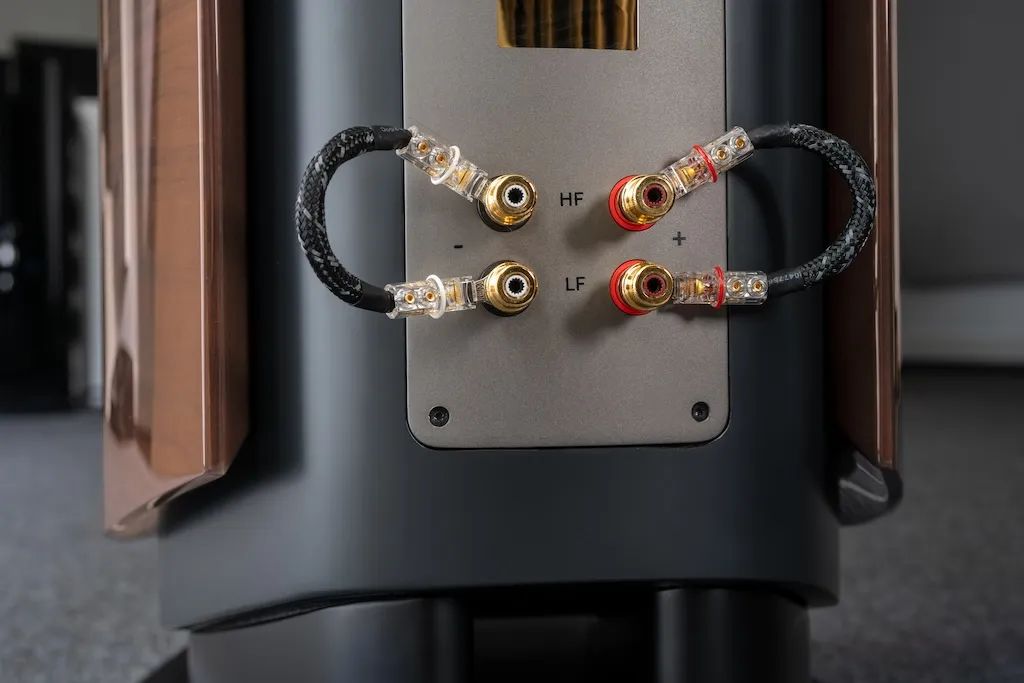 接線端子被安裝在鋁制后面板之上,這款接線端子是WBT下一代系列中的卓越型號(hào)。其設(shè)計(jì)獨(dú)特,四個(gè)端子能夠獨(dú)立控制高頻與低頻,從而達(dá)成雙線與雙功放的效能。同時(shí),為確保信號(hào)傳輸?shù)姆(wěn)定性與效率,canton特別選用了由WBT nextgen電纜插頭與CantoLink 600電纜共同構(gòu)成的電纜橋架。這一組合不僅能提供卓越的電氣性能,還確保了接線端子的穩(wěn)固與可靠。