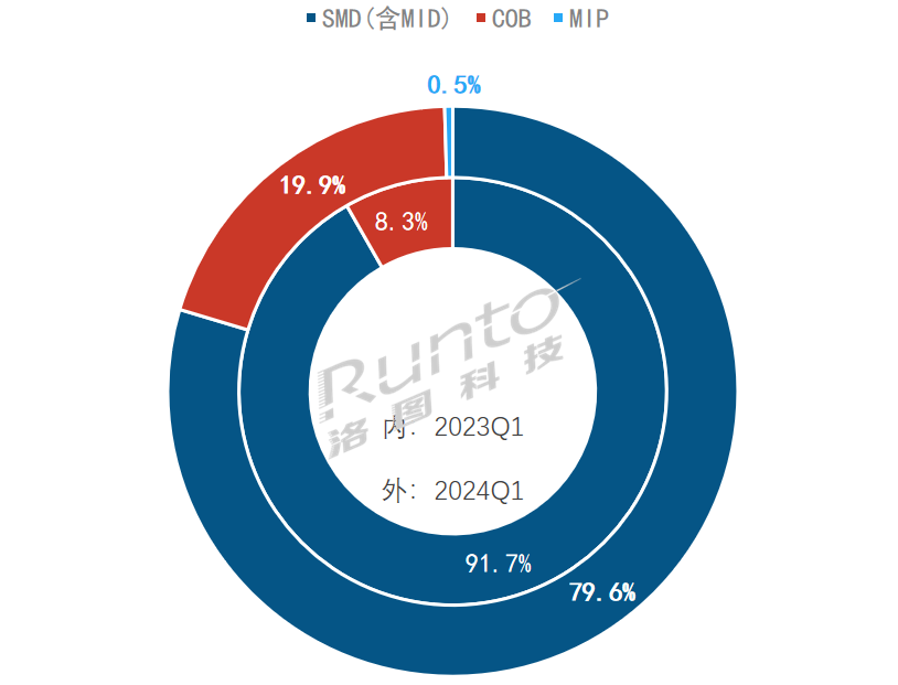 2024年Q1 中國大陸小間距LED顯示屏市場按面積封裝技術(shù)結(jié)構(gòu)及變化